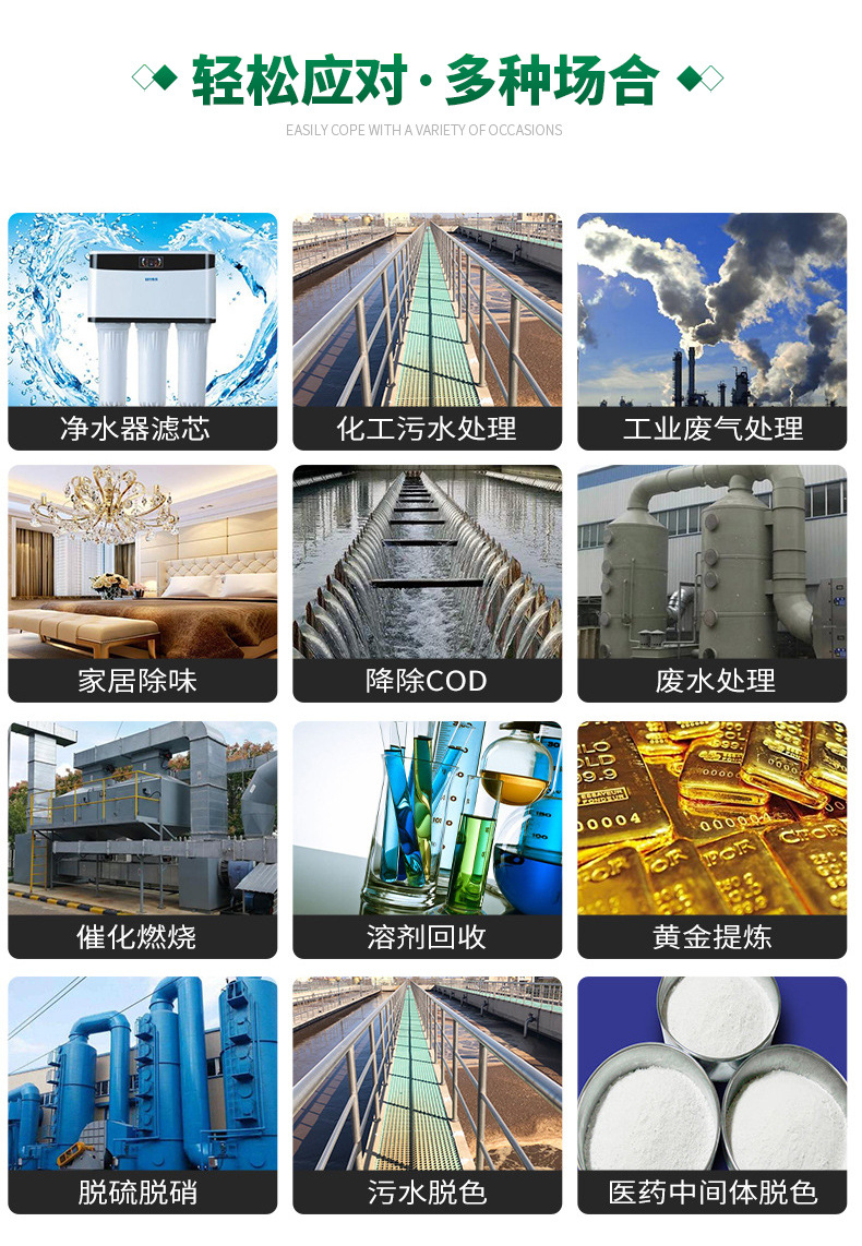 杏殼活性炭被廣泛應(yīng)用于飲用水、工業(yè)用水和廢水的深度凈化生活、工業(yè)水質(zhì)凈化及氣相吸附,如電廠、石化、煉油廠、食品飲料、制糖制酒、醫(yī)藥、電子、養(yǎng)魚、海運(yùn)等行業(yè)水質(zhì)凈化處理,能有效吸附水中的游離氯、酚、硫和其它有機(jī)污染特,特別是致突變物(THM)的前驅(qū)物質(zhì),達(dá)到凈化除雜去異味。還可用于工業(yè)尾氣凈化、氣體脫硫、石油催化重整,氣體分離、變壓吸附、空氣干燥、食品保鮮、防毒面具、解媒載體,工業(yè)溶劑過(guò)濾、脫色、提純等。各種氣體的分離、提純、凈化;有機(jī)溶劑回收;制糖、味精、醫(yī)藥、酒類、飲料的脫色、除臭、精制;貴重金屬提煉;化學(xué)工業(yè)中的催化劑及催化劑載體。產(chǎn)品更具脫色、提純、除雜、除臭、去異味、載體、凈化、回收等功能。