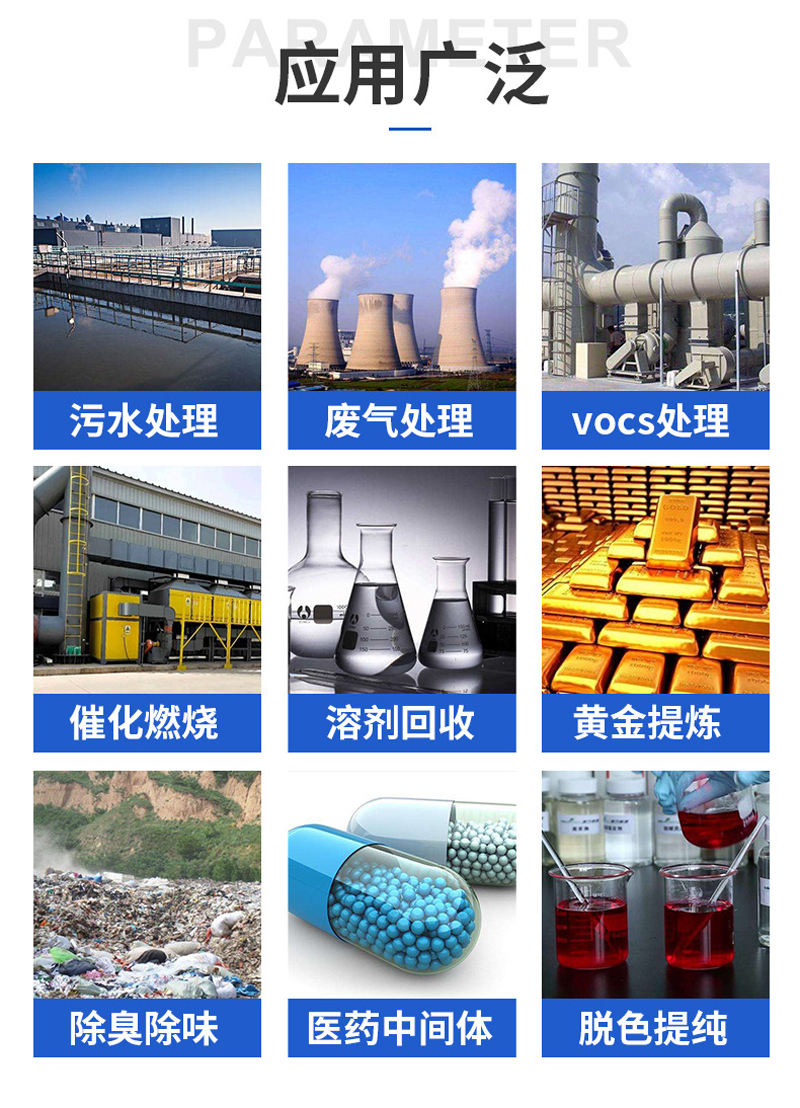 主要用于水處理及食品、醫藥、化工、工業、鋼廠、電廠、電鍍等行業產品的精制、脫色、脫臭、提純等方面。